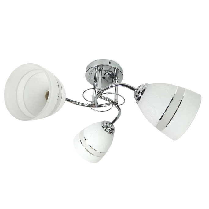 Каркас выполнен из материала металл, цвет хром. Плафоны (светорассеиватели) выполнены из материала стекло, цвет белый. Цоколь E27 рассчитан на лампы максимальной мощности до 40 Вт, а максимальная площадь освещения составит до 7 м².