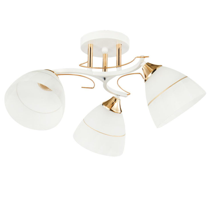 Потолочный светильник 13215/3WT FGD WT_4 от бренда ЭкономСвет. Каркас выполнен из материала металл, цвет белый, золотой. Плафоны (светорассеиватели) выполнены из материала стекло, цвет белый. Цоколь E27 рассчитан на лампы максимальной мощности до 40 Вт, а максимальная площадь освещения составит до 7 м².