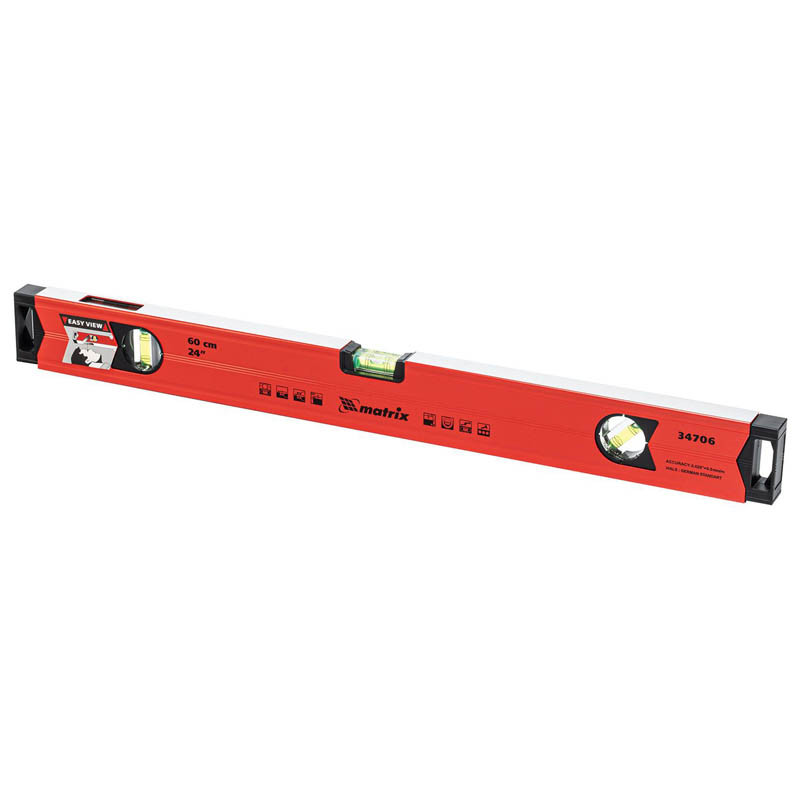 Алюминиевый магнитный уровень Matrix 34706 длиной 600 мм, усиленный, оснащен 3 глазками и одним зеркальным отражателем. С его помощью можно выявить отклонения от вертикали, горизонтали и угла 45 градусов. Встроенный зеркальный глазок повышает удобство работы, позволяя легко считывать показания. Для определения отклонения вертикали 90 градусов необходимо использовать пузырьковую ампулу только в верхнем положении уровня. Только базовая поверхность является рабочей (противоположная ампуле 180 градусов).