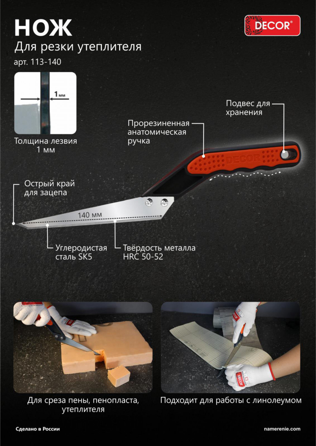 Нож для изолирующих материалов и утеплителя 140мм DECOR 113-140 имеет острый край для зацепа, оснащён прорезиненной анатомической ручкой с подвесом для хранения, а так же защитной планкой на лезвии для безопасного хранения и транспортировки.