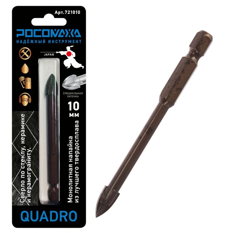 Сверла РОСОМАХА QUADRO с 4 режущими гранями 10 мм обладают высоким ресурсом при работе c керамической плиткой любой твердости, керамограниту и стеклу благодаря последним достижениям в производстве твердосплавных напаек и выбору самого лучшего сырья для производства. Крестовая напайка обеспечивает более чистые отверстия. Сверление рекомендуется производить на пониженных оборотах дрели, с охлаждением водой самого сверла и места сверления.