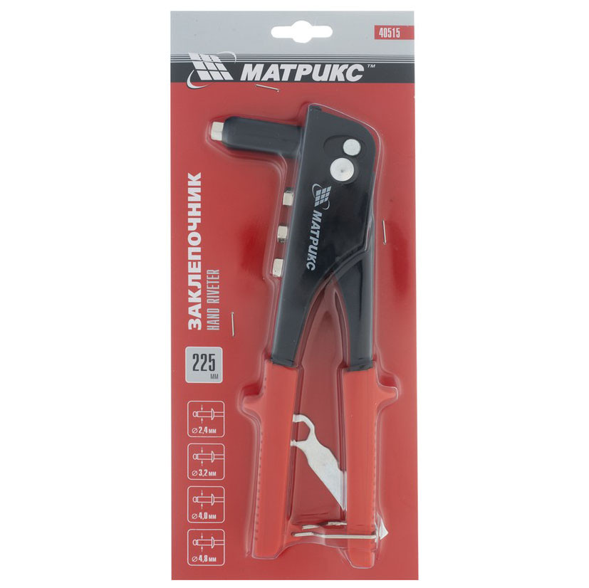 Заклепочник Matrix 40515, 225 мм, заклепки 2,4-3,2-4,0-4,8 мм. Рабочие части инструмента изготовлены из конструкционной стали. В комплект заклепочника входят четыре насадки под разные диаметры заклепок и ключ для их замены. Предназначен для установки алюминиевых заклепок при скреплении заготовок и деталей.