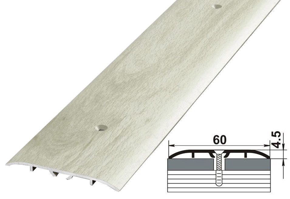 Плоский профиль шириной 60 мм с гладкой поверхностью поверхностью. С монтажными отверстиями. Предназначен для декоративной стыковки любых двух одноуровневых поверхностей.