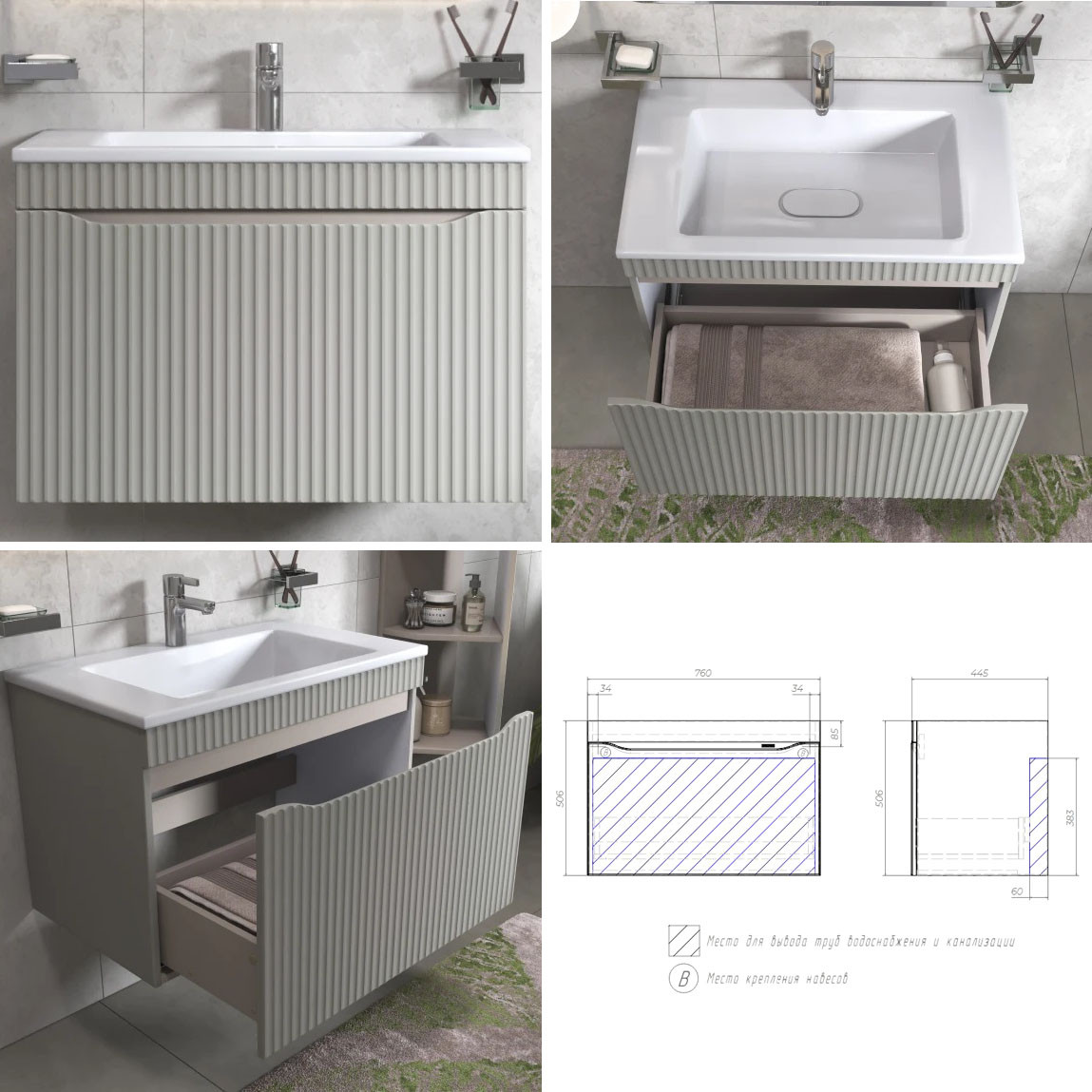 - Материалы тумбы: влагостойкая МДФ, полимерное покрытие ПВХ