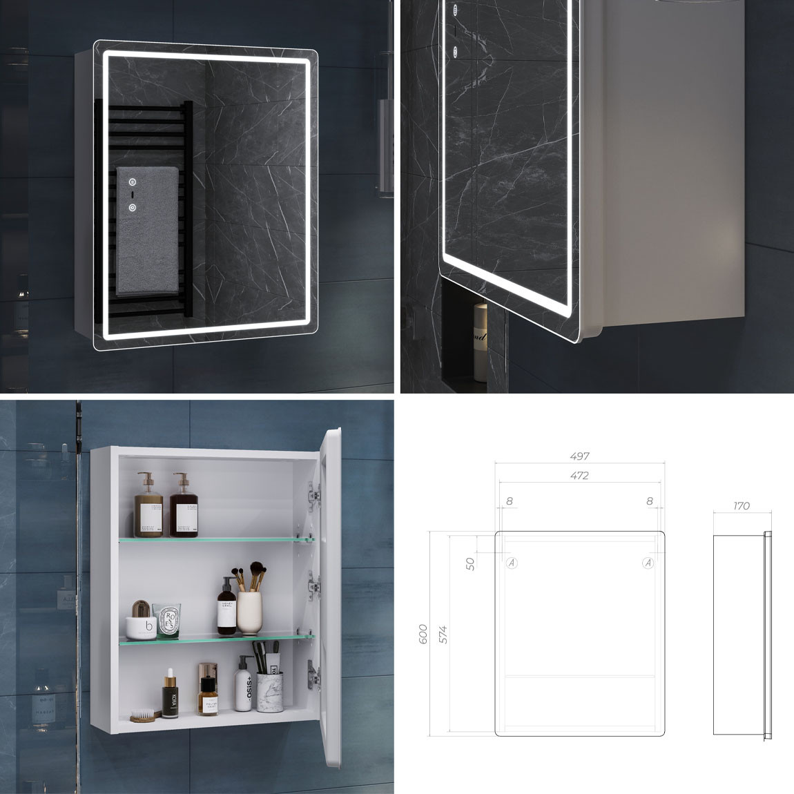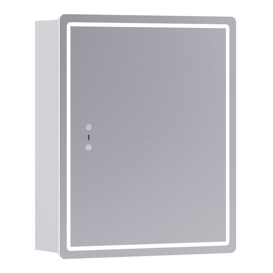 Оснащение: 1 дверца, петли с механизмом доводчика, 2 стеклянных полки, светодиодная подсветка по периметру, датчик присутствия, сенсорное включение, функция антизапотевания, диммер.