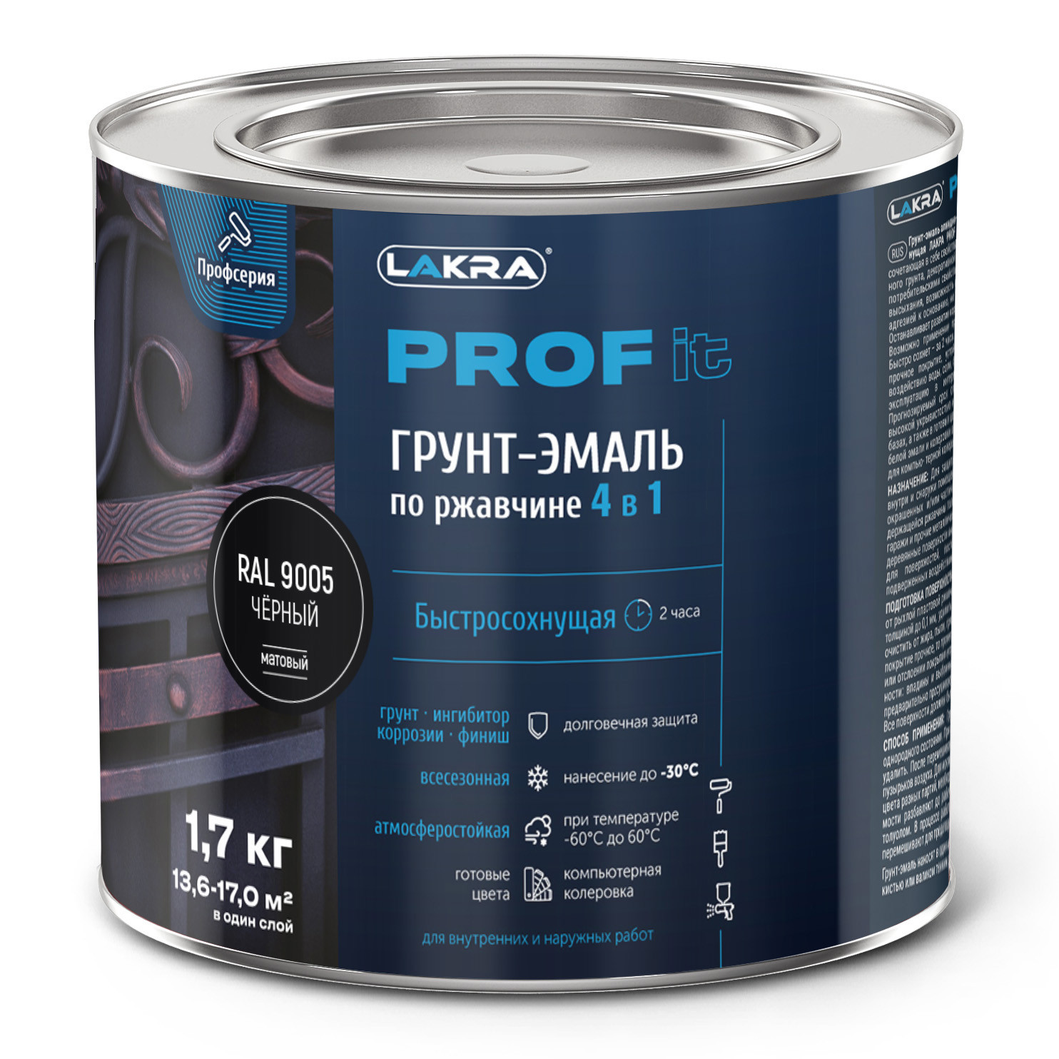 Грунт-эмаль по ржавчине 4 в 1 ЛАКРА PROF IT, Быстросохнущая, всесезонная (-30°С), гладкая. Для защиты и окраски металлических поверхностей, эксплуатируемых внутри и снаружи помещений: чистых свободных от ржавчины, ранее окрашенных и/или частично подвергнутых коррозии со слоем плотно держащейся ржавчины толщиной до 0,1 мм (100 мкм) - заборы, ограды, решетки, гаражи и пр. металлические детали и конструкции. Допускается нанесение на деревянные поверхности внутри и снаружи помещений. Не использовать для поверхностей, постоянно погруженных в воду, а также подверженных воздействию агрессивных жидкостей и растворителей. Состав: синтетические смолы, антикоррозионные пигменты и наполнители, функциональные добавки, ароматические растворители.