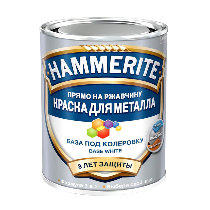 Краска для металла HAMMERITE гладкая, глянцевая база под колеровку BC (насыщенные тона) с формулой 3 в 1 (грунт, ингибитор коррозии, финишное покрытие) легко и быстро защищает металл от ржавчины, придает красивый внешний вид поверхности.