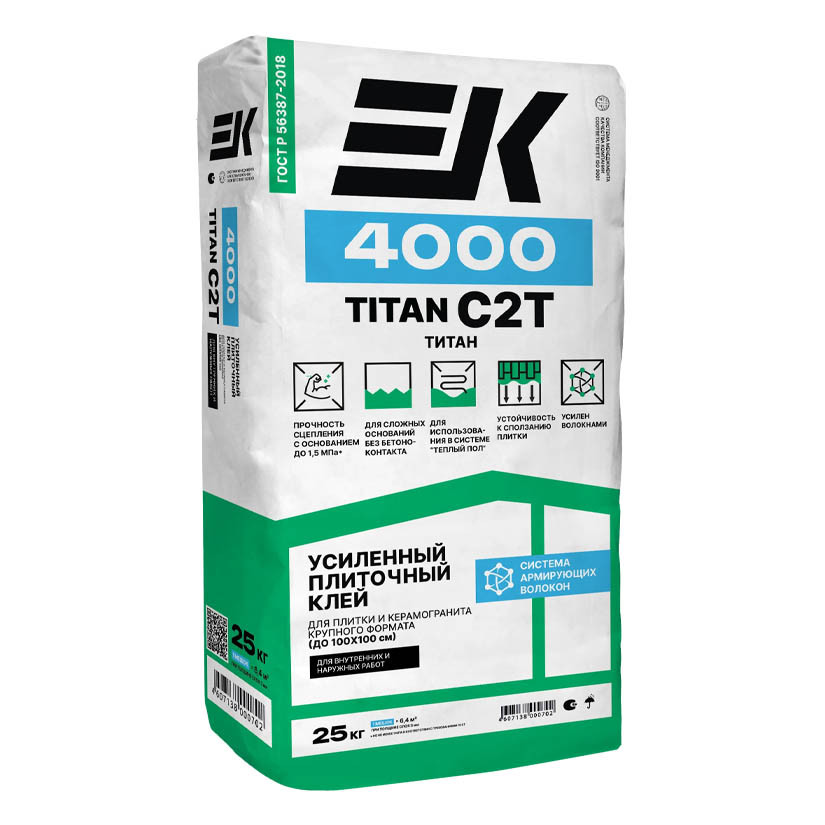 Клей ЕК 4000 TITAN/ТИТАН – смесь сухая строительная клеевая C1 Т, ГОСТ Р 56387-2018. Изготовлена на основе цементного вяжущего, минеральных наполнителей, фракционированного песка и модифицирующих добавок, улучшающих эксплуатационные свойства. Применяется для укладки плит из керамогранита крупного формата, природного и искусственного камня с любым водопоглощением, мозаики, керамической плитки на вертикальные и горизонтальные оштукатуренные, бетонные, газобетонные, кирпичные, гипсокартонные и другие минеральные основания, в том числе и невпитывающие (старая облицовка, окрашенные поверхности). Можно использовать для приклеивания теплоизоляционных плит (кроме экструдированного пенополистирола). Возможна укладка плитки методом «сверху-вниз». Подходит для внутренних работ в помещениях с нормальной и повышенной влажностью. Рекомендован для использования в системе «Теплый пол».