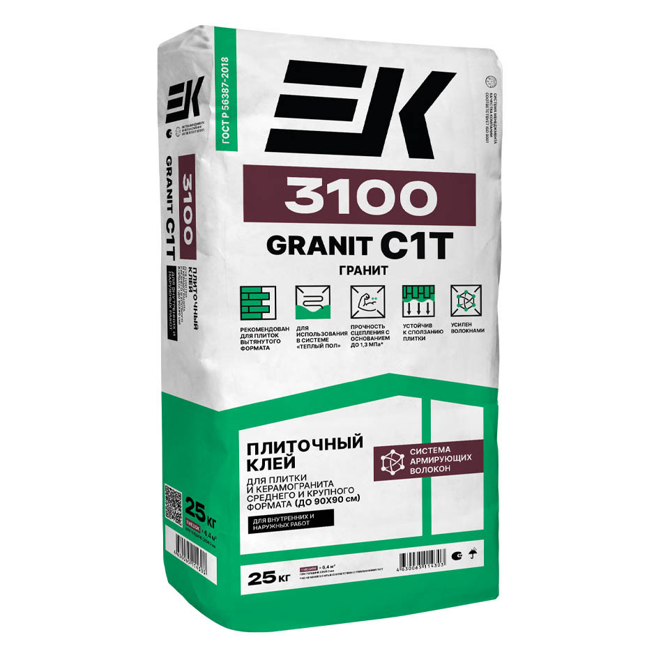 Клей ЕК 3100 GRANIT/ГРАНИТ применяется для укладки керамической плитки любого формата, керамогранита, плит из натурального и искусственного камня с водопоглощением не менее 1% среднего и крупного формата (до 90х90 см) при условии нанесения клея комбинированным способом. При укладке керамической плитки и керамогранита допускается локальное выравнивание плиточным клеем небольших неровностей стен и полов (до 15 мм). Укладка плитки на вертикальные основания при слое от 10 до 15 мм производится с использованием стартового профиля. Предназначен для наружной и внутренней облицовки недоформирующихся оснований, подверженным нормальным эксплуатационным нагрузкам. Подходит для внутренних работ в помещениях с нормальной и повышенной влажностью. Возможно использование в системе «Теплый пол».