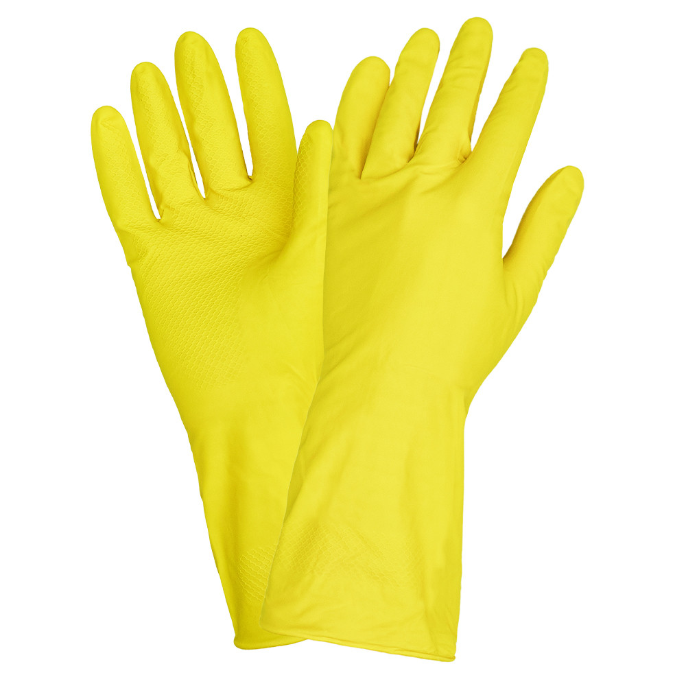 Хозяйственные перчатки произведены из высококачественного латекса с внутренним нанесением хлопка. Рифленая поверхность перчаток позволяет удерживать скользкие предметы. Перчатки имеют анатомическую форму для снижения усталости при работе.